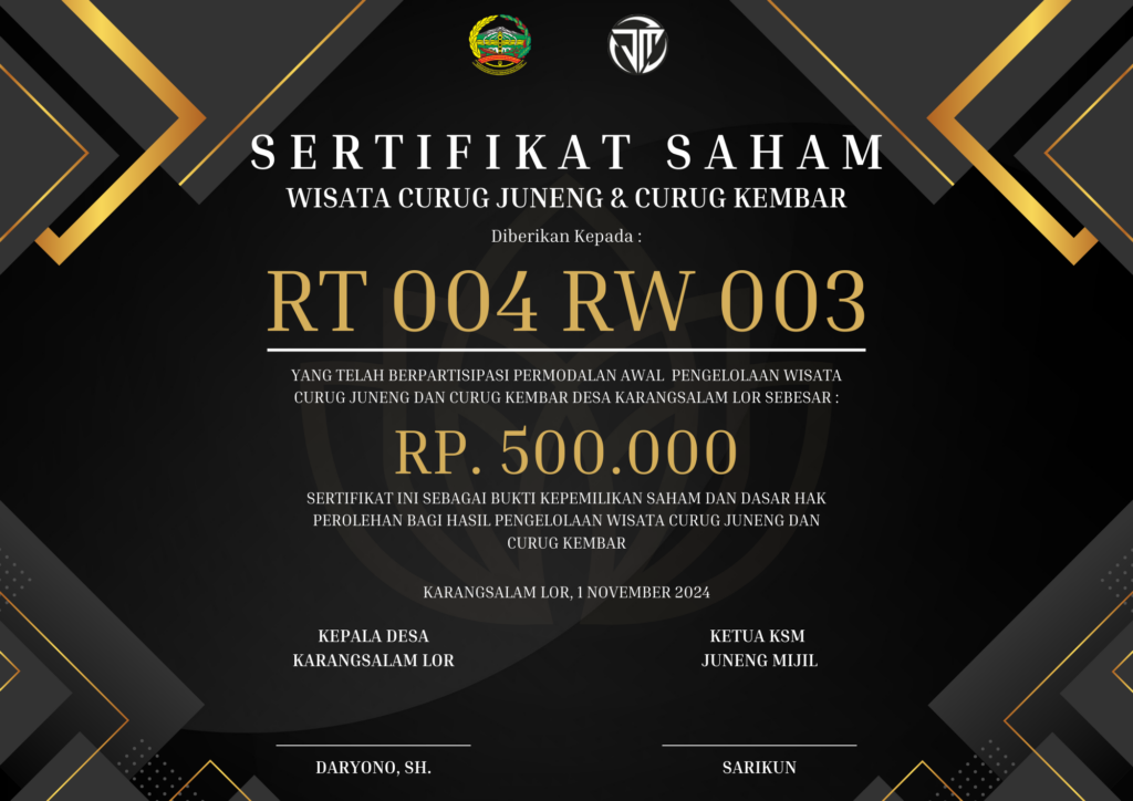 Selain menjadi solusi pendanaan, dengan bergabunggua RT/RW yang tidak lain adalah dana mandiri warga desa diharapkan mempunyai rasa memiliki wisata tersebut dan akan merasakan langsung dampak (Keuntungan) dari kegiatan wisata di Curug Juneng dan Curug Kembar. Besaran investasi awal yang disepakati adalah Rp. 500.000 per RT/RW, penyamarataan nilai investasi juga sebagai bentuk keadilan tidak memandang RT/RW